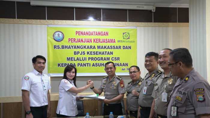 Berkerja sama dengan BPJS Kesehatan, program donasi yang dilakukan RS Bhayangkara ini berhasil mendaftarkan 100 orang anak panti asuhan binaaan dengan kepesertaan kelas dua selama satu tahun kedepan. Perjanjian kerja sama tersebut ditandatangani langsung oleh Kepala Rumah Sakit Bhayangkara Makassar Farid Amansyah dan Greisthy E.L Borotoding selaku kepala BPJS Kesehatan Cabang Makassar.