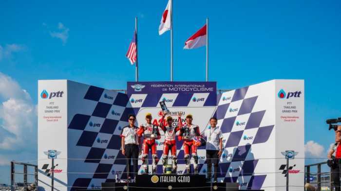 KAREBANUSA.COM, JAKARTA - Dua pebalap muda binaan PT Astra Honda Motor (AHM) berhasil mempersembahkan podium pada dua balapan yang digelar pada Asia Talent Cup (ATC) 2019 seri keempat di Chang International Circuit, Buriram, Thailand (5-6/10). Bendera Merah Putih dikibarkan Herjun Atna Firdaus dari podium kedua pada balapan pertama dan Afridza Munandar dari podium ketiga pada balapan kedua.