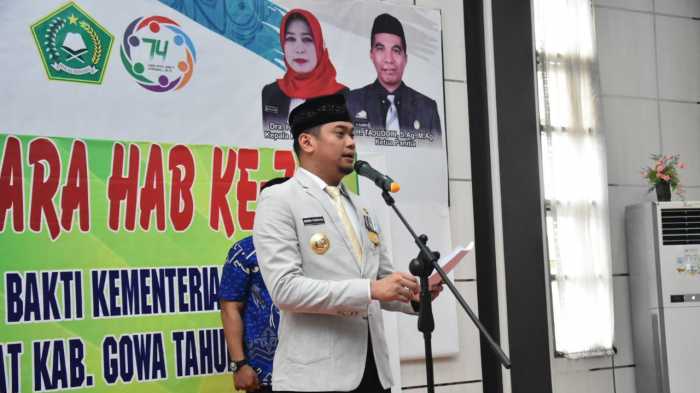 Hal ini diungkapkan Bupati Gowa Adnan Purichta Ichsan saat membacakan sambutan seragam Menteri Agama RI Fachrul Razi saat bertindak sebagai Inspektur Upacara Hari Bakti ke-74 Kementerian Agama Tingkat Kabupaten Gowa Tahun 2020 di Aula Al Amanah, Kantor Kementrian Agama Kabupaten Gowa, Jumat, (3/1).