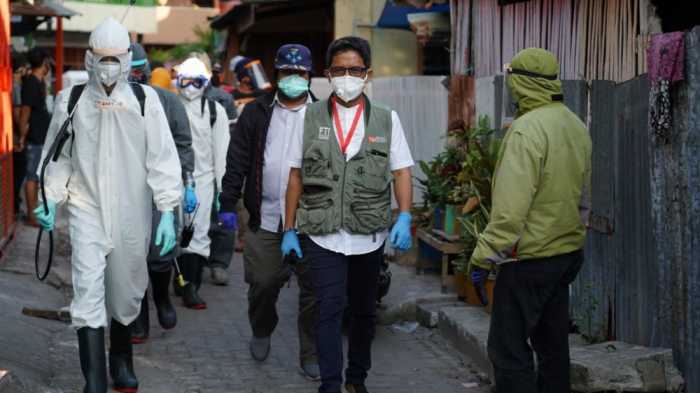 Selain melakukan penyemprotan, tim relawan juga menyerahkan APD dan hand sanitizer kepada ketua RW 1 yang sehari-hari melayani kebutuhan warga yang melakukan isolasi mandiri.
