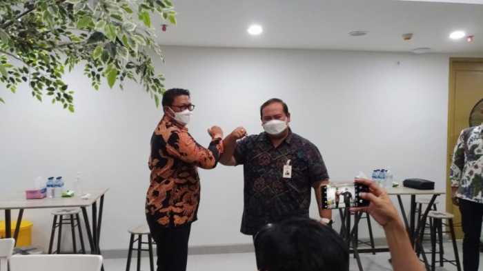 CEO Region X PT Bank Mandiri (Persero) Tbk, Muhammad Ashidiq Iswara (kiri) melakukan salam Covid-19 bersama pejabat lama, Angga Erlangga Hanafie. Foto: ApriKAREBANUSA.COM, Makassar - Pimpinan PT Bank Mandiri (Persero) Tbk Region X (Sulawesi dan Maluku) berganti.