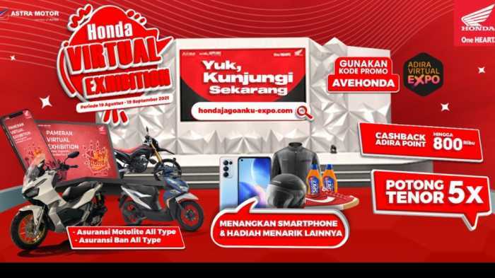 Honda Virtual Exhibtion merupakan pameran yang akan memberikan sensasi mengunjungi showroom motor Honda secara virtual serta bisa dilakukan dari mana dan kapan saja. Gelaran Honda virtual exhibition juga sebagai wujud inovasi Astra Motor untuk para konsumen setia Honda agar mudah membeli motor secara online melalui Virtual Exibition yang dapat di akses pada link www.hondajagoanku-expo.com.(*)