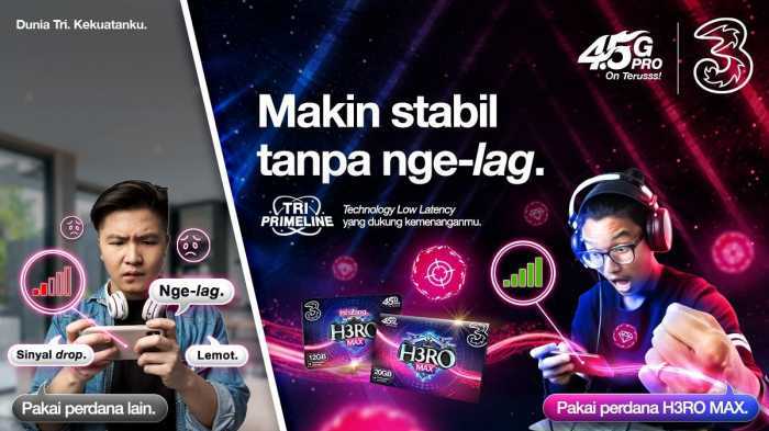 Perdana H3RO Max dan Paket H3RO Unlimited telah dilengkapi dengan teknologi Tri Primeline dengan service awareness yang secara otomatis akan memberikan prioritas jaringan ketika pengguna 3 bermain game online favorit seperti PUBG, Mobile Legend, Free Fire, AOV dan Call of Duty. Terlebih, teknologi ini mampu menurunkan latency dalam permainan hingga hampir 30% meskipun diakses di jam-jam sibuk.