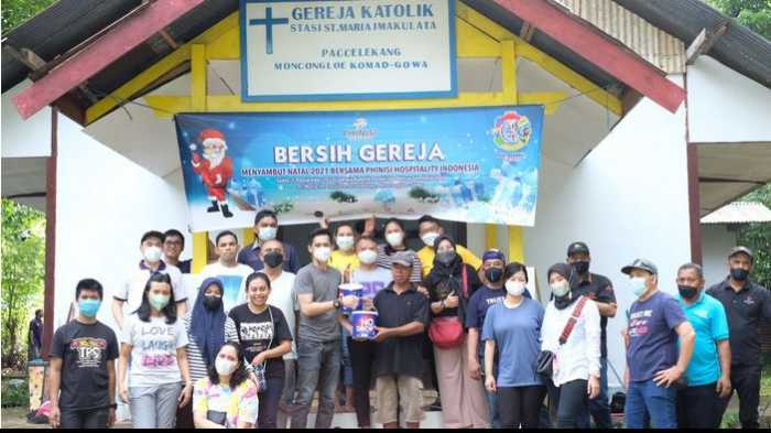 KAREBANUSA.COM, Makassar – Jelang Natal 2021, hotel yang berada di bawah naungan PT Phinisi Hospitality Indonesia yaitu Claro Hotel, Almadera Hotel, Dalton Hotel, The Rinra Hotel, dan Phinisi Point melakukan kegiatan Corporate Social Responsibilty (CSR) berupa kerja bakti membersihkan area Gereja Stasi St Maria Immaculata di Paccelekang, Moncongloe, Gowa.