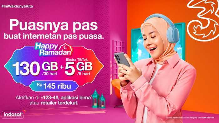 Tanpa melupakan kebutuhan akan konektivitas yang nyata, Tri juga memberikan rangkaian produk Ramadan Happy untuk kebutuhan digital pelanggan dengan variasi paket data lebih besar dan harga yang jauh lebih hemat yaitu Happy 130GB untuk 30 hari seharga Rp145.000 plus ekstra TikTok 5GB selama 5 hari.