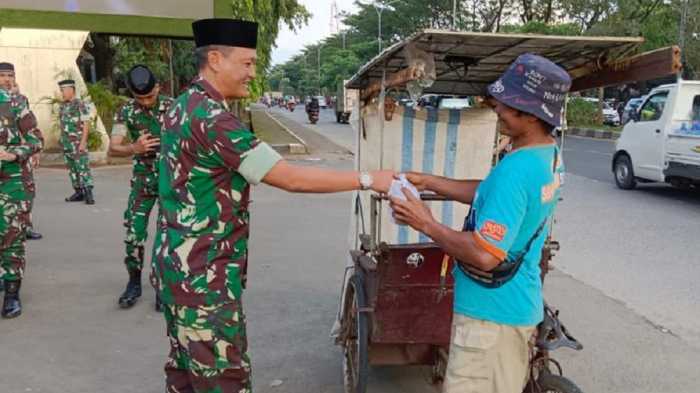 KAREBANUSA.COM, Makassar - Sansidam XIV/Hasanuddin melakukan aksi sosial dengan membagikan takjil kepada warga yang lewat di depan Makodam, Jalan Urip Sumoharjo, Makassar, Senin (3/4/2023).