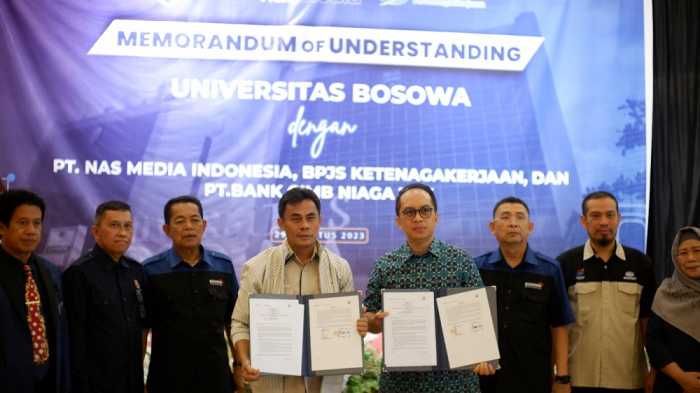 KAREBANUSA.COM, Makassar - Universitas Bosowa (Unibos) menandatangani Memorandum of Understanding (MoU) bersama tiga lembaga besar di Indonesia yaitu PT Nas Media, BPJS Ketenagakerjaan, dan CIMB Niaga.